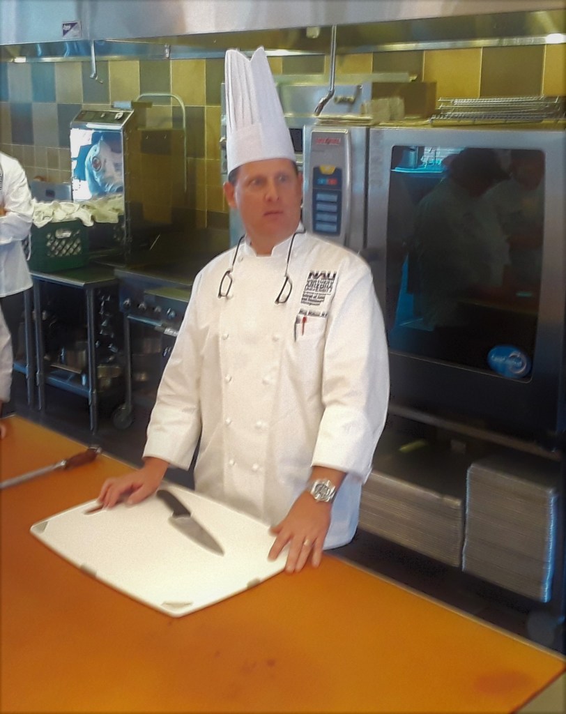 Today I’m starting with Day 2 of Week 2 since the transitions work better that way. As usual, everyone showed up 15 minutes before the start of class for attendance taking, phone sanitizing and hand washing. Then began the demonstration on how to properly use a chef’s knife! After about fifteen minutes of demonstrating, Chef had all of the tables grab cutting boards, knives and a knife honer so that we could practice the technique that he had taught us. I’ll quickly summarize the lesson.