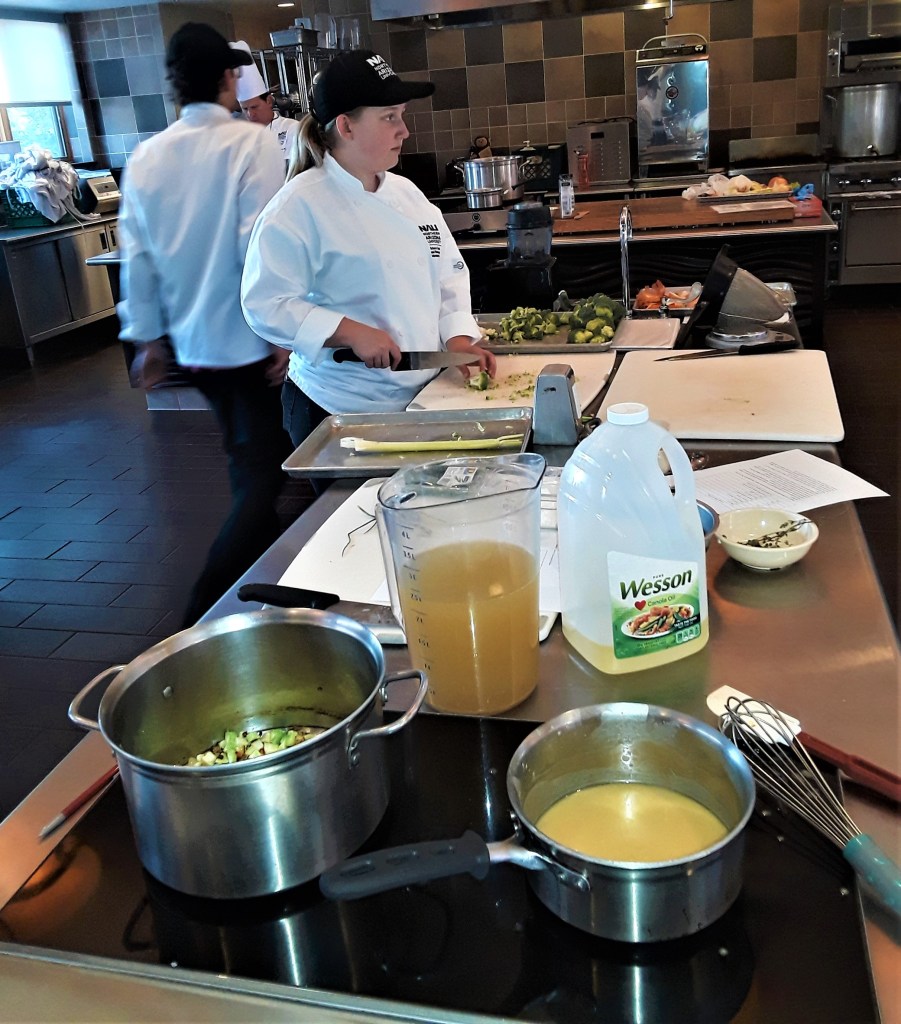 Day 1 of Week 5 was Prep Day for Cream of Broccoli! How stressful! We got her done even though I personally made many mistakes along the way. Jasmine was certainly the rock of the team. She was cranking out peeled and sliced vegetables like a well-oiled machine. Steve seemed like he was doing a decent job making the potato puffs. My job was to focus on getting the velouté ready as soon as possible, and I didn’t. My bad. The velouté didn’t get on the move until there was about 25 minutes left of class, and it takes 45 minutes to an hour to prepare properly. I stayed after class to finish cooking, pureeing and cooling however, and it looks and tastes decent enough to serve. I hope.