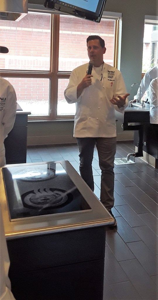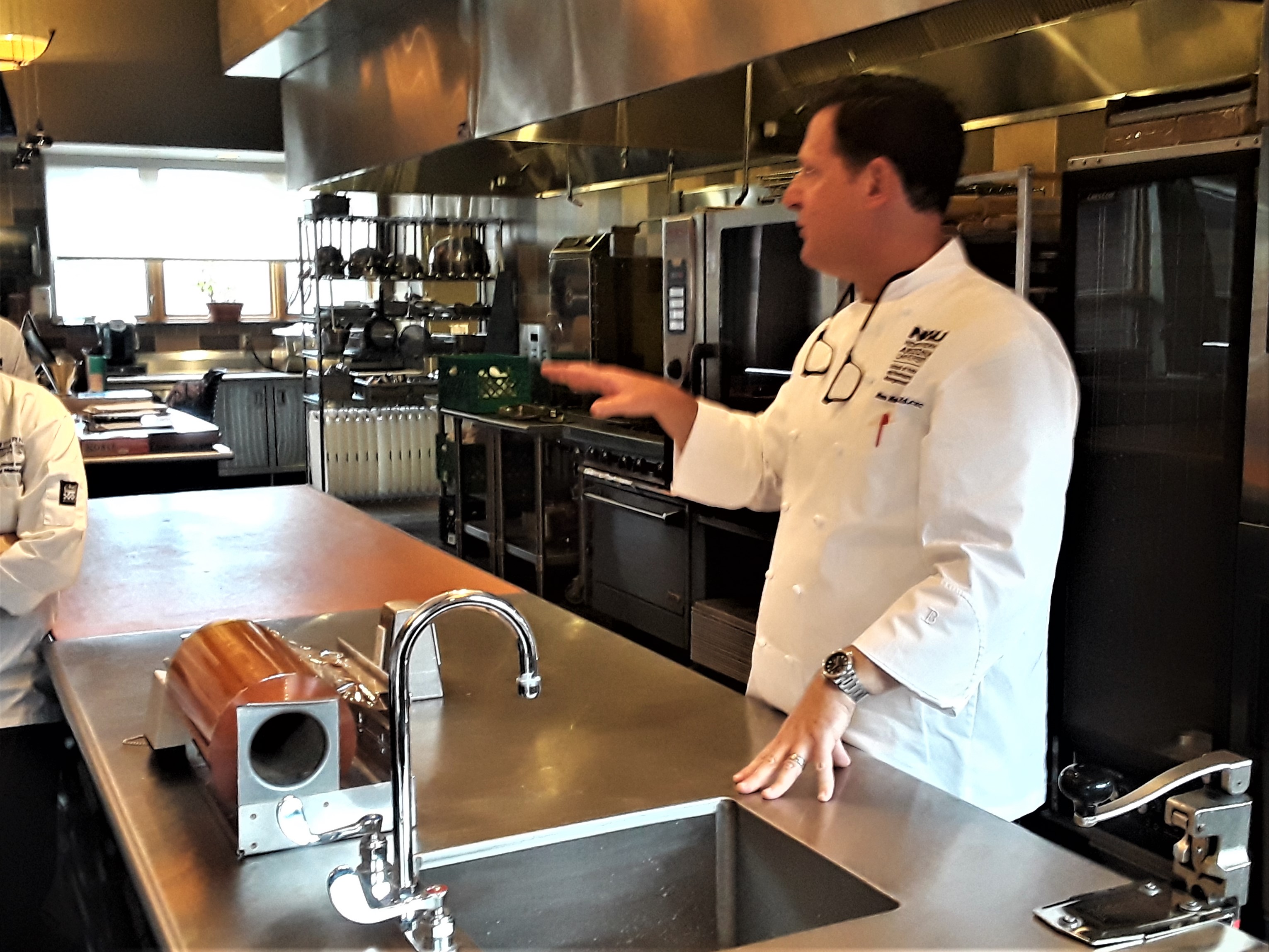 Here’s yet another blurry picture of Chef Mark. This time though, he is walking around the kitchen speaking charismatically to his students about class expectations and culture.